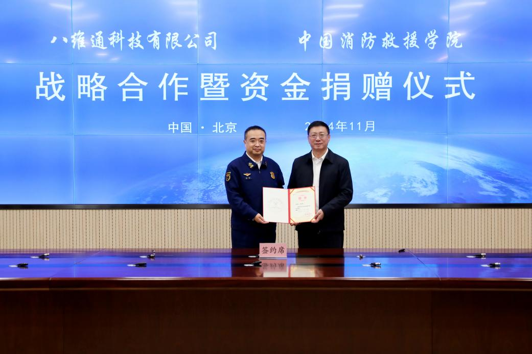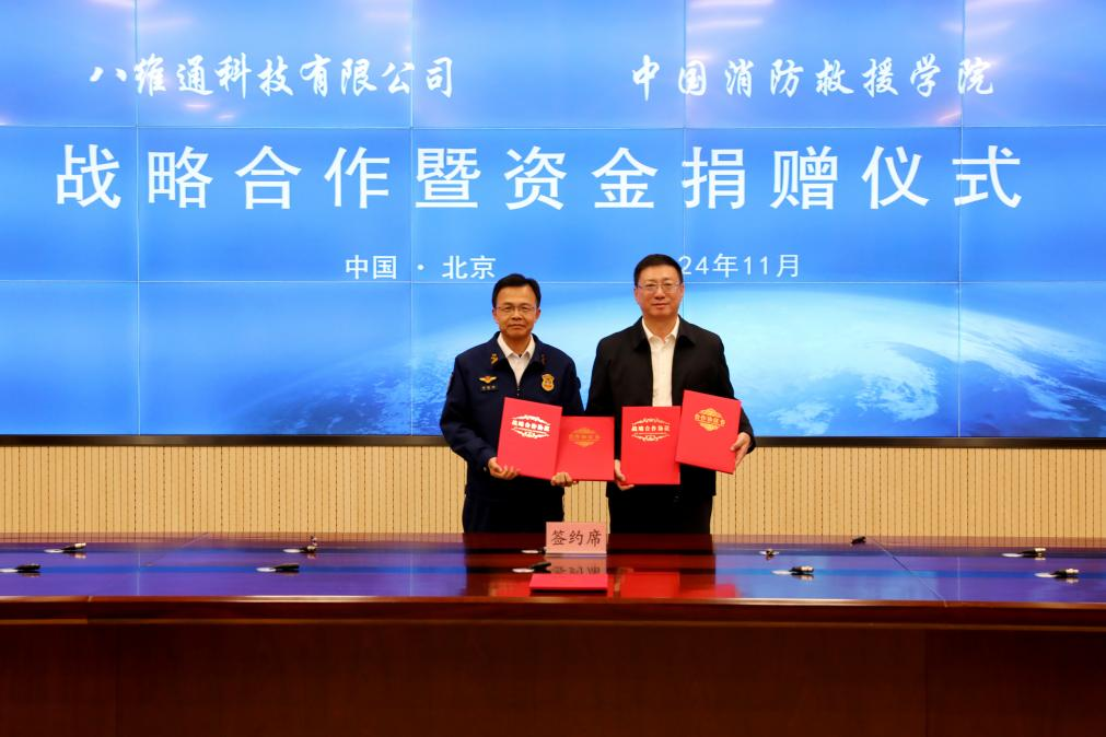 11月22日,八維通科技有限公司與中國消防救援學院戰略合作暨資金捐贈儀式在北京舉行。中國消防救援學院黨委書記沈宇、院長閆勝利、黨委副書記郭富偉及相關部門負責人,八維通科技有限公司董事長楊宏旭、總經理余華瓊、首席數字官鄭航等領導共同出席儀式。