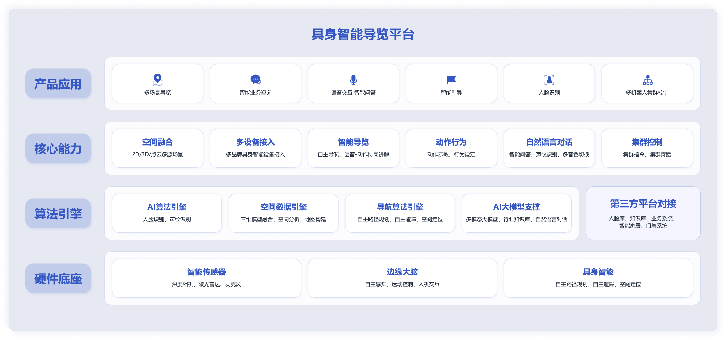 具身智能導覽平臺統(tǒng)一接入與管理各類機器人,具備智能導覽、獨舞與集群舞蹈、動作行為互動、智能語音問答、動作示教等多項功能。平臺致力于助力各單位實現(xiàn)數(shù)字化服務轉(zhuǎn)型,打造沉浸式、個性化、高效率的新一代智慧服務新體驗。