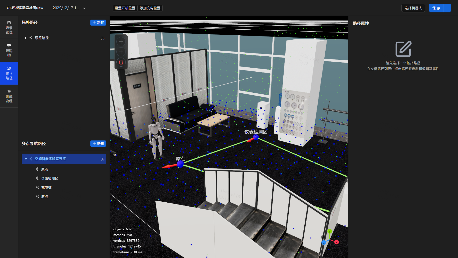 平臺提供可視化地圖構(gòu)建工具,支持通過圖形化界面快速創(chuàng)建、編輯靜態(tài)障礙物與路徑點,實現(xiàn)導覽路徑的動態(tài)維護與優(yōu)化,確保導航環(huán)境持續(xù)匹配實際場景。